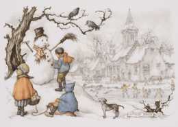 De kalenderplaten ademen warme, tijdloze nostalgie, met winterse taferelen, ambachten en romantische details.
